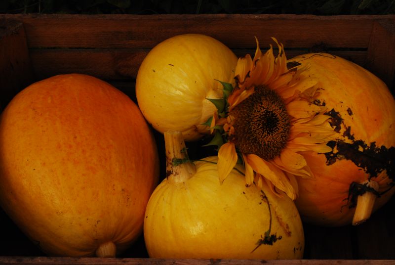 Dynie zaskoczyły mnie niesamowicie, rozrosły się na mega obszarze, na razie zebraliśmy te większe;] Jabłek też cała skrzynka, do tego słoneczniki. Słowem, żyć nie umierać!